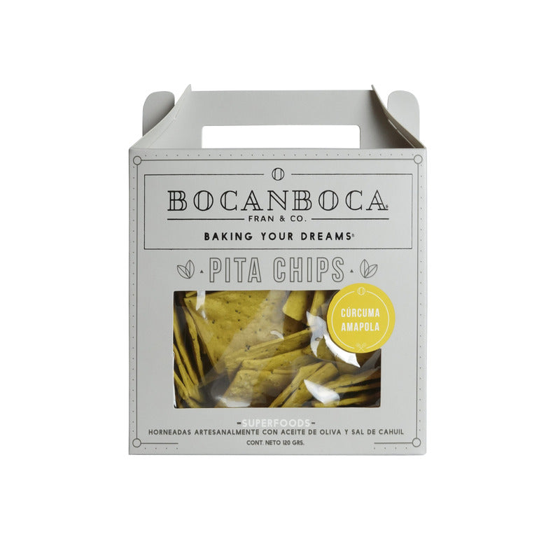 Pita chips Bocanboca Cúrcuma Amapola son elaboradas artesanalmente con harina de trigo, horneadas con aceite de oliva extravirgen y sal de mar de Cahuil. Son libres de colesterol, huevo, leche y soja. Apta para veganos , no contienen aditivos. Crujientes, livianas, del tamaño perfecto y se complementan con todos los sabores.