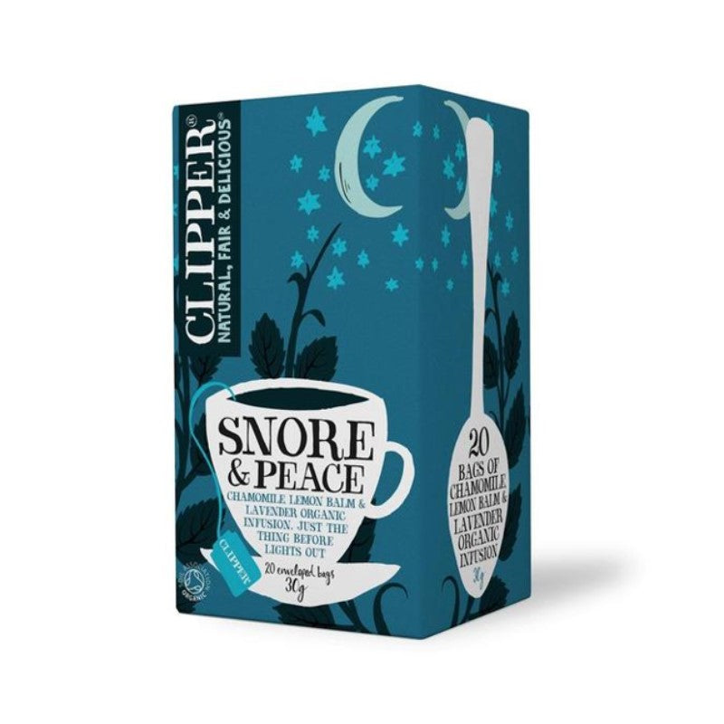 20 bags de infusión Snore & Peace marca Clipper Ingredientes: manzanilla, bálsamo de limón, limoncillo, lavanda, semilla de hinojo, rosa mosqueta , menta, saborizante natural.